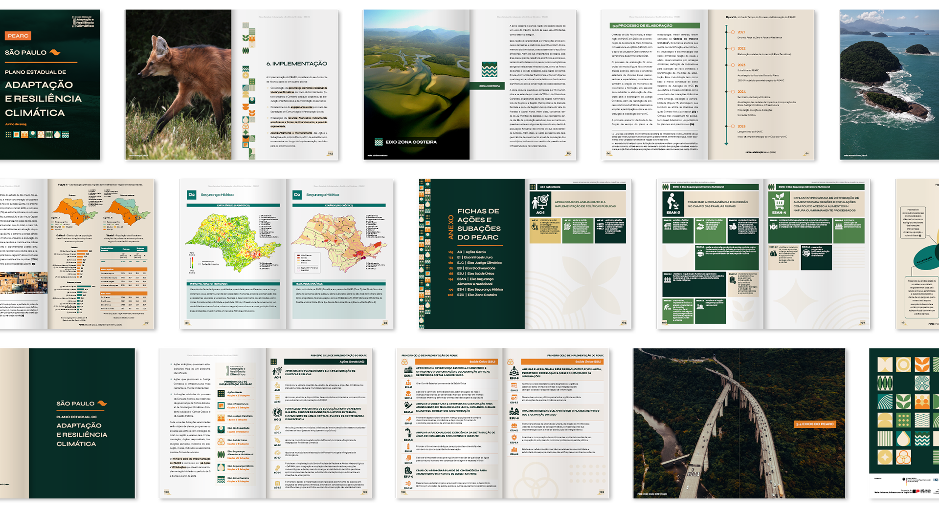 Projeto gráfico e diagramação de plano técnico e estratégico (224 páginas), com estruturação de conteúdos técnicos e territoriais, incluindo dados, mapas, fichas técnicas e infográficos.